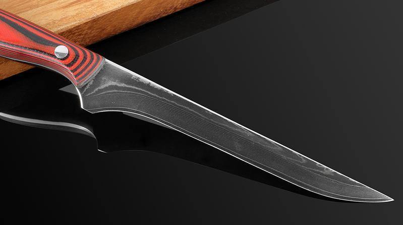 A lâmina desta faca fina é uma combinação de 67 camadas de aço, o que a torna uma das mais fortes lâminas de aço de Damasco. É extremamente afiada e durável. A superfície da lâmina tem um efeito de água corrente, típico de facas autênticas de aço de Damasco.